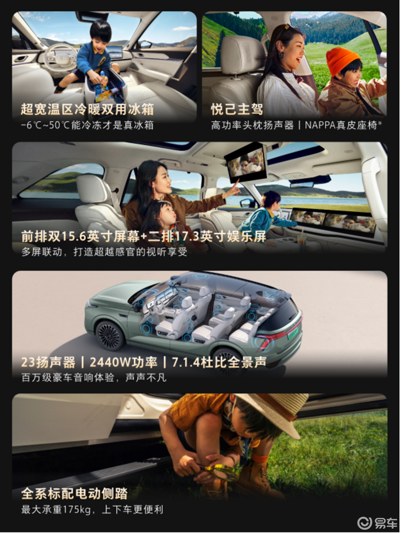 23扬声器7.1.4全景声、后排17.3英寸3K娱乐屏,打造移动影院。独家“晕动舒缓显示”功能,有效缓解家人行车时看屏幕的晕车感,细节处见真心。
