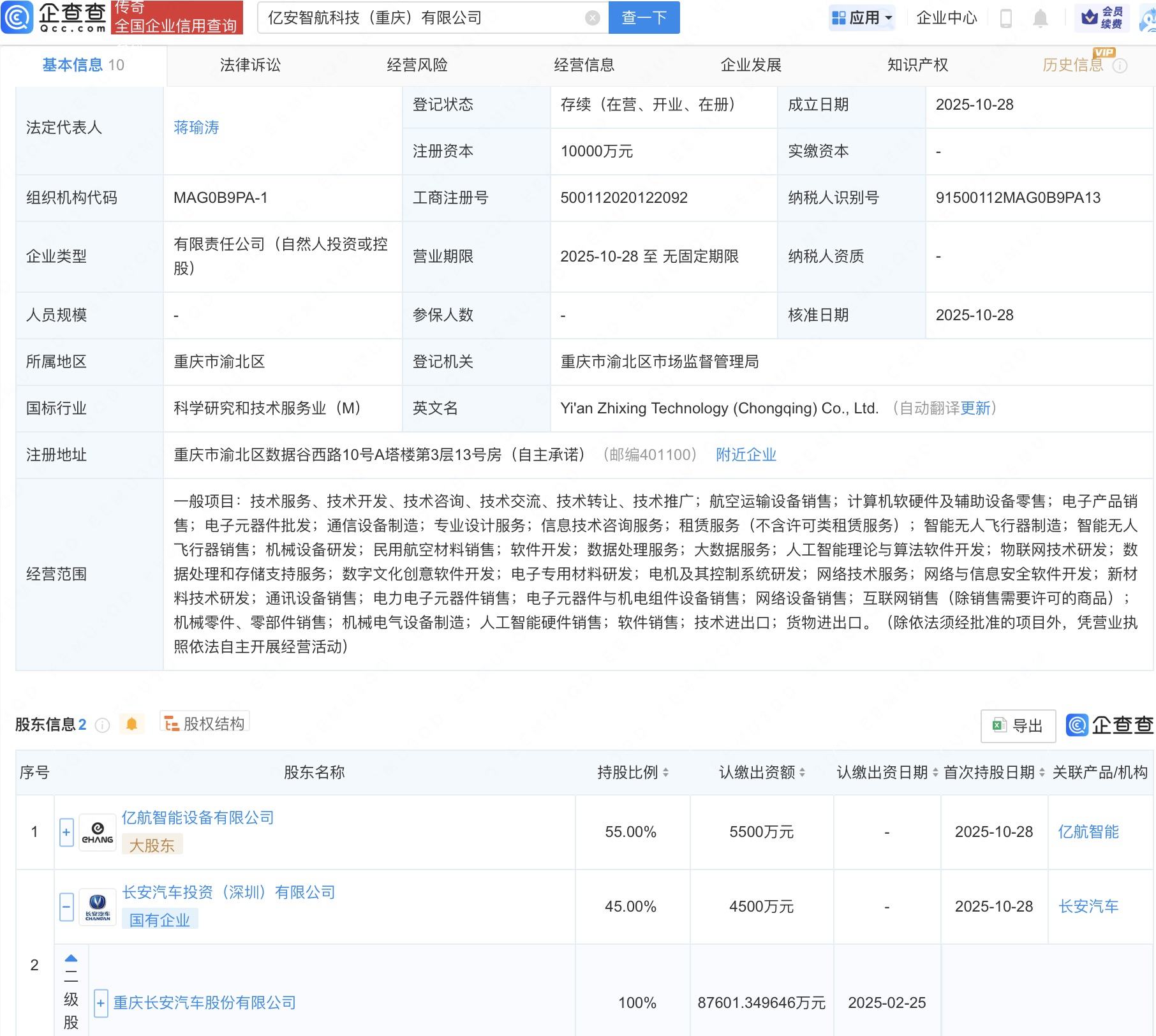 企查查APP显示,近日,亿安智航科技(重庆)有限公司成立,法定代表人为蒋瑜涛,注册资本1亿人民币,经营范围包括智能无人飞行器制造、智能无人飞行器销售、人工智能理论与算法软件开发等。企查查股权穿透显示,该公司由长安汽车(000625)全资子公司长安汽车投资(深圳)有限公司、亿航智能设备有限公司共同持股。